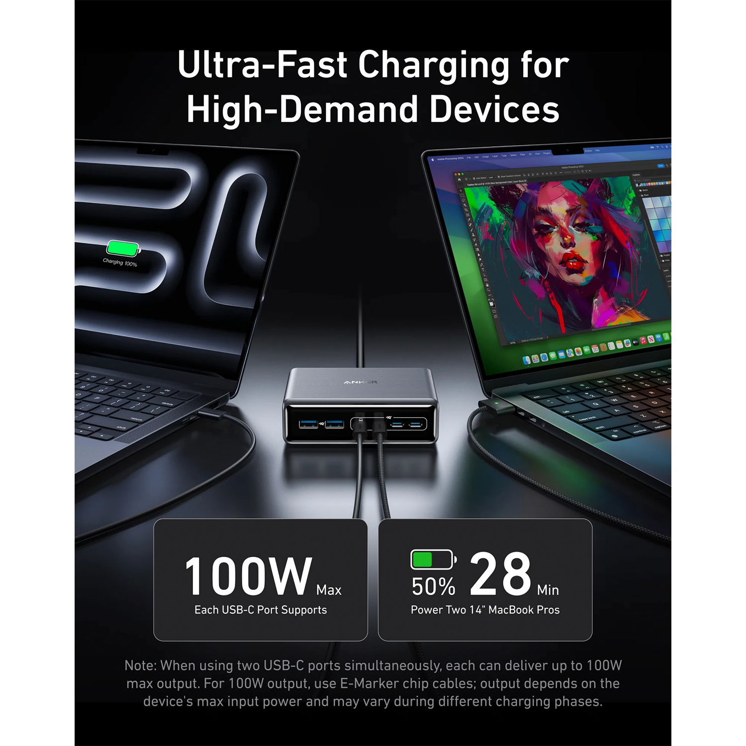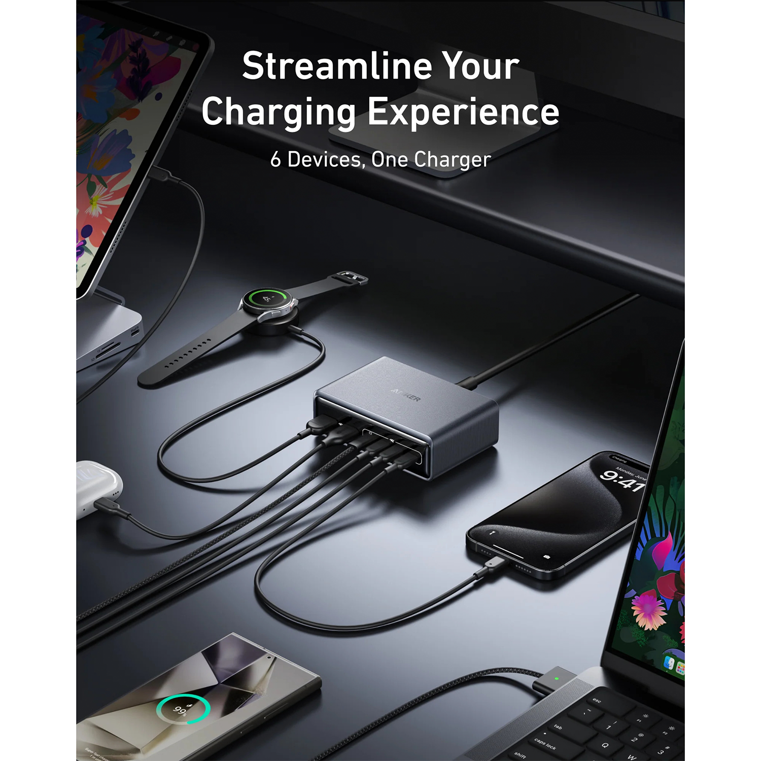 The Anker Prime Charger 200 W is a premium multi-port desktop charger built for power users. With cutting-edge GaN technology, it delivers up to 200 W total output through 6 ports — 4 USB-C and 2 USB-A — so you can charge your laptop, smartphone, tablet, and accessories all at once. Each USB-C port can output up to 100 W individually, while intelligent power distribution ensures every connected device gets optimal charging. Compact, efficient, and safe, it’s the perfect replacement for multiple bulky adapters at your desk or in your travel bag.