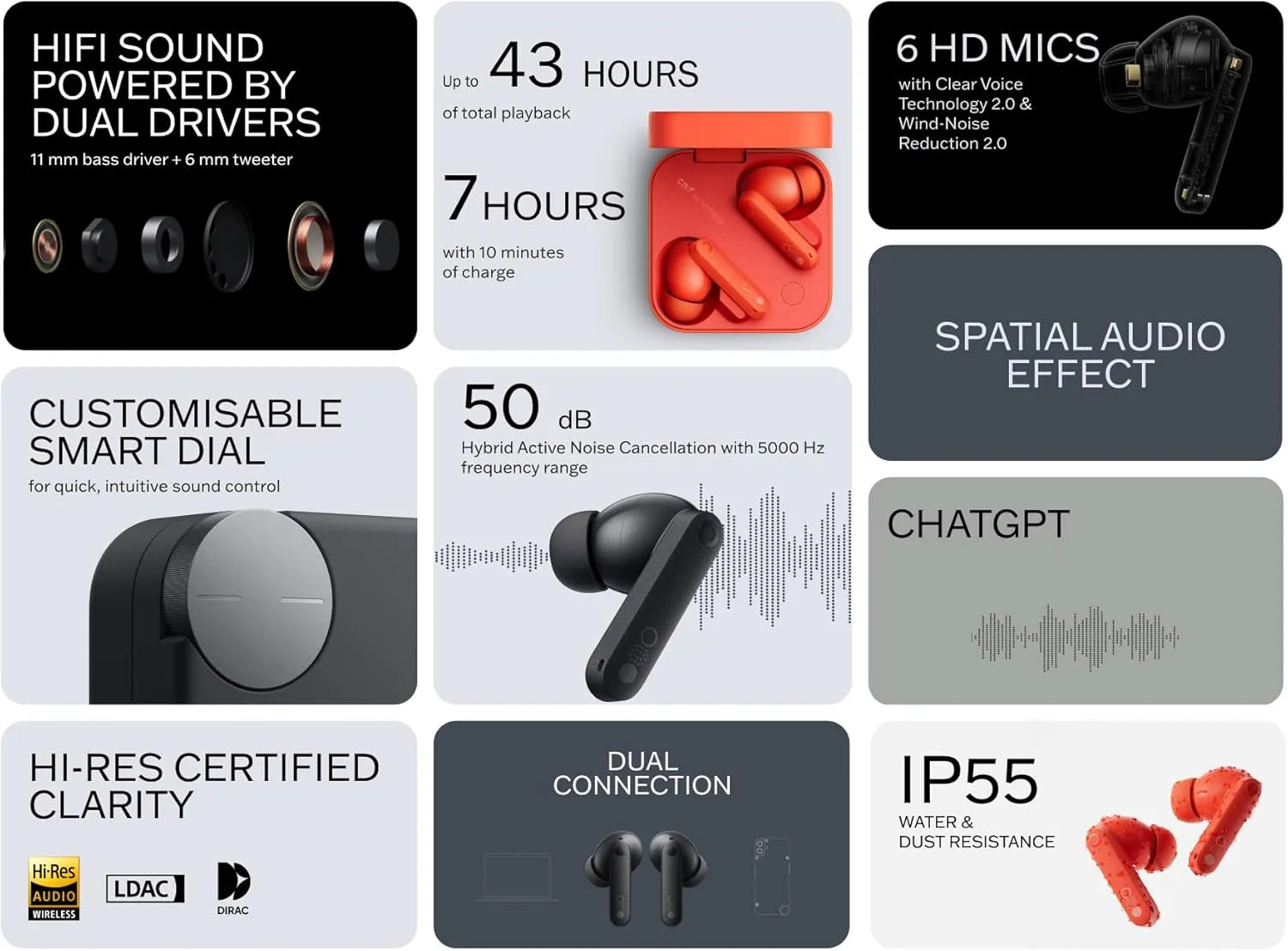 | Charging Case Controls | Adjust settings and switch modes directly from the case. |